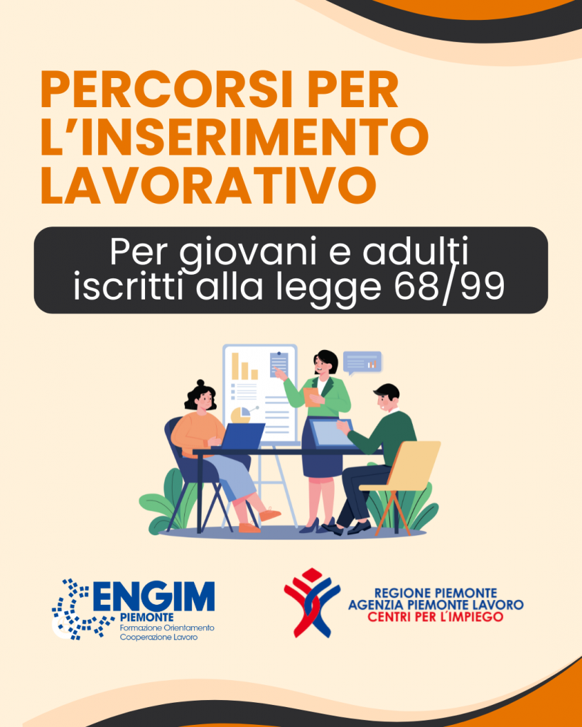 Agenzia Piemonte Lavoro ed ENGIM propongono due diversi percorsi formativi rivolti a persone iscritte alla legge 68/99 e finalizzati all’inserimento lavorativo.