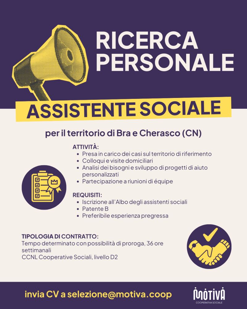 MOTIVA COOP. SOCIALE RICERCA ASSISTENTE SOCIALE A BRA E CHERASCO Annunci di lavoro Lavoro12 Marzo 202612 Marzo 2026 bragiovani Tag#bra#disoccupati#offertedilavoro