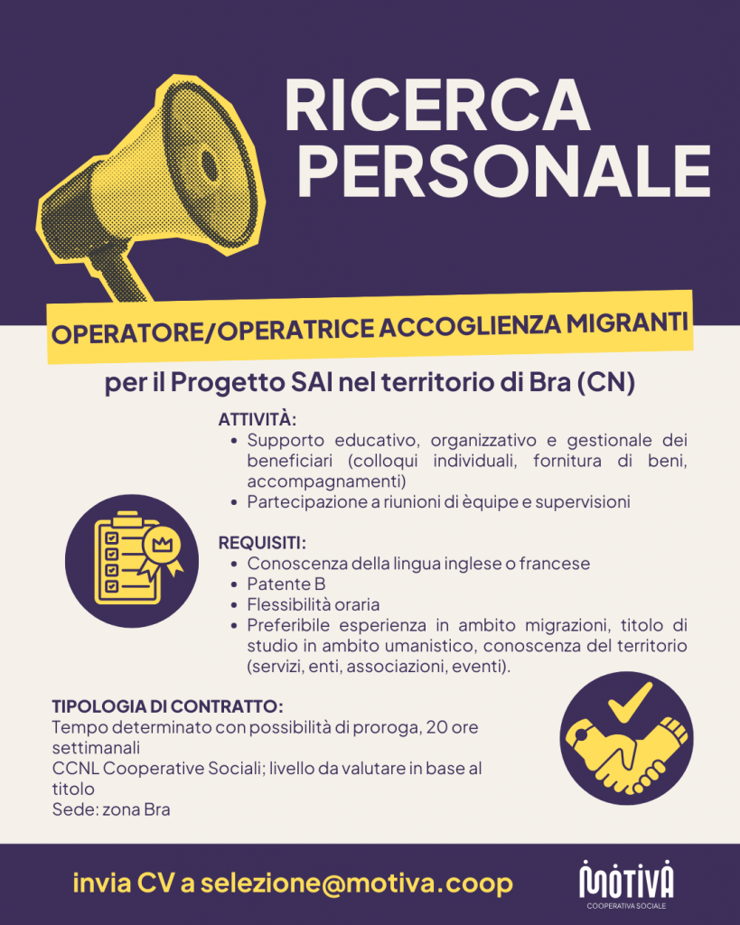 MOTIVA COOP. SOCIALE RICERCA OPERATORE / OPERATRICE ACCOGLIENZA MIGRANTI A BRA Annunci di lavoro Lavoro24 Febbraio 202624 Febbraio 2026 bragiovani Tag#bra#giovani#lavoro#migranti#offertedilavoro#sociale