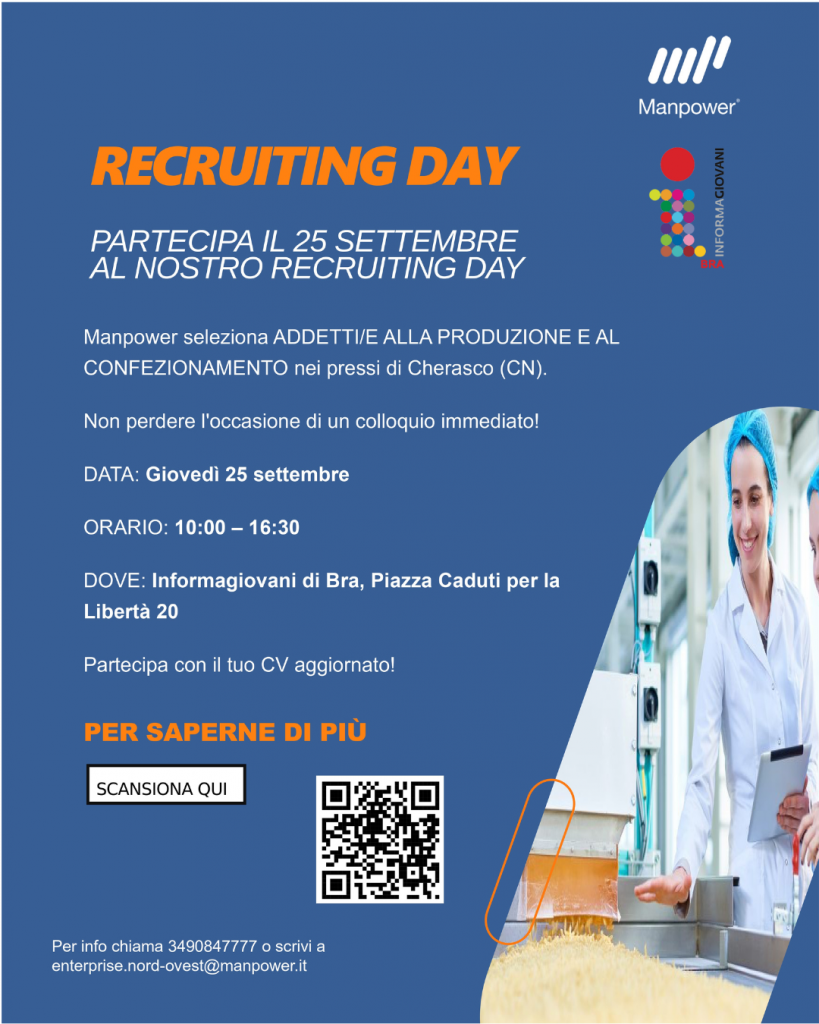 👉👉GIORNATA DI SELEZIONE MANPOWER – SI RICERCANO ADDETTI ALLA PRODUZIONE ED AL CONFEZIONAMENTO Posted on 18 Settembre 202526 Settembre 2025 By bragiovani 📅 DATA: Giovedì 25 SETTEMBRE⌚ ORARI: DALLE 10.00 ALLE 16.30📍 DOVE: INFORMAGIOVANI BRA, PALAZZO MATHIS, PIAZZA CADUTI PER LA LIBERTA’ 20, BRA Informazioni utili ricerca lavoro, Lavoro Tags:#disoccupati, #offertedilavoro, #recruitingday